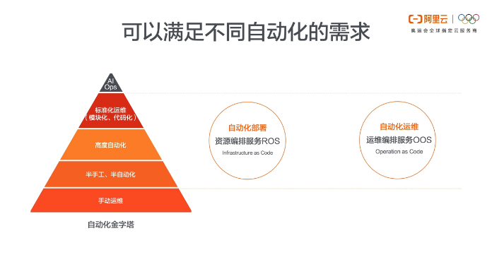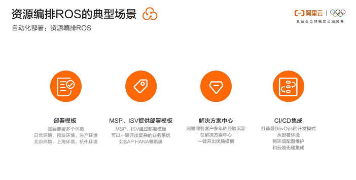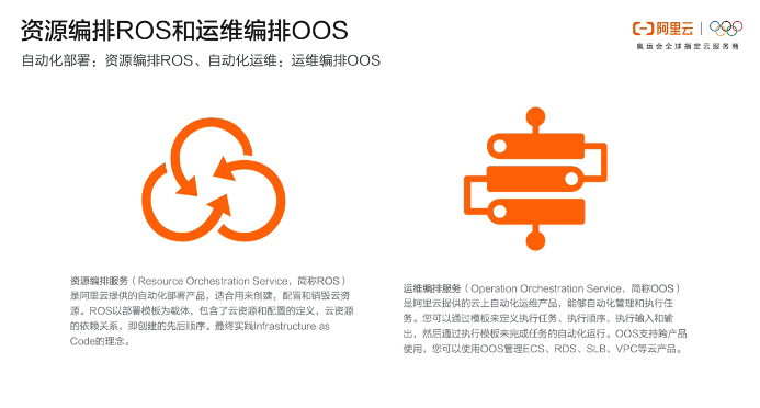 阿里云针对云上部署和运维特点,推出了两个产品,包括资源编排 ROS(Resource Orchestration Service)——解决自动化部署问题,运维编排 OOS(Operation Orchestration Service)——解决自动化运维问题。两款编排产品除了支持 ECS 的实例,还支持其它阿里云的产品,如负载均衡,关系型数据库 RDS,对象存储 OSS 等。