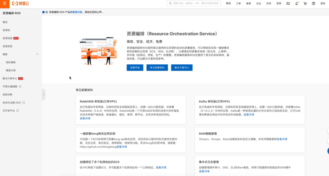 下图是资源编排 ROS 主页(https://rosnext.console.aliyun.com/),上方对 ROS 产品进行了简单的介绍;下方是常见的部署架构作为示例模版。