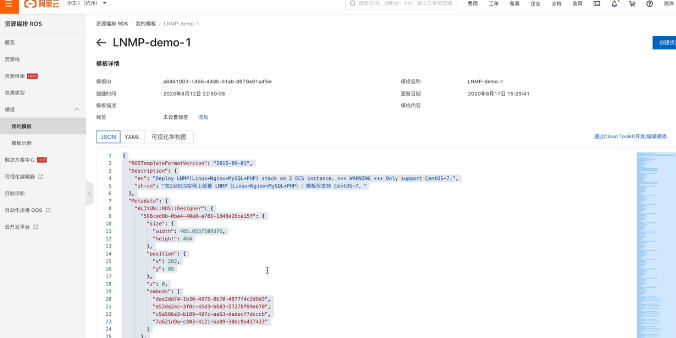 下面以构建我的模版 LNMP-deom-1 作为例子,模版以 JSON 格式表达,也支持 YAML 格式,最重要的是,还提供了可视化的架构图。