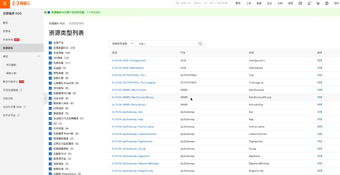 “资源类型”模块中展示了 ROS 支持的阿里云云产品。