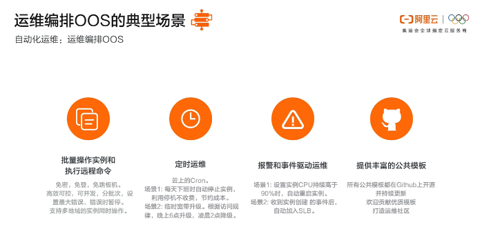 第四是提供大量丰富的公共模版,阿里云总结了大量的典型运维场景,并将总结成果开源到了 Github 上,欢迎大家贡献优质模版,共同打造运维社区。