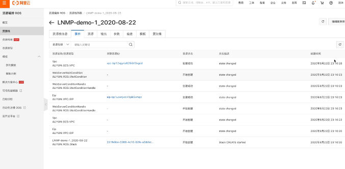 接着可以使用此模版创建资源栈,之后通过事件 tab 知道每一步创建步骤。在资源 tab 中看到所有被模版创建的资源,只需要点击资源 ID,就可以打开实例详情页面。在输出 tab 在有显示一个网站链接,可以发现此次网站部署成功。参数 tab 中提供了每次模版的参数。当用户手动修改一些资源,与模版出现不一致时,可以使用检查资源偏差查看不同点。