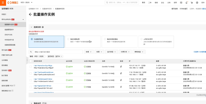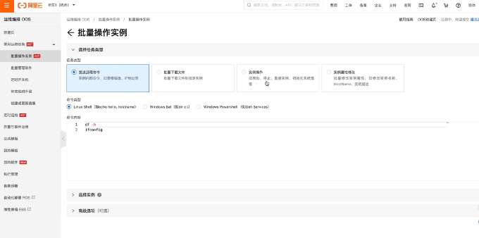 下图展示的是批量操作实例,发送远程命令,命令内容是发送输出命令。之后选择实例,可以手动选择,可以指定实例标题,也可以指定实例资源组,或者上传 csv 文件,从 ECS 实例表中导出 csv 文件来选择实例。