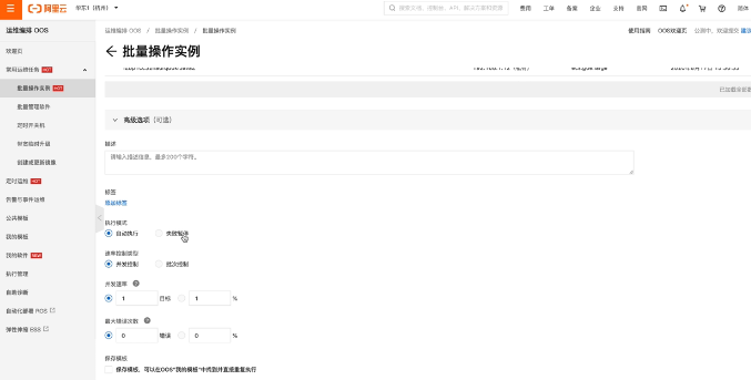 下图是运维编排 OOS 主页(https://oos.console.aliyun.com/),左侧菜单栏中有批量操作实例模块,任务类型包含发送进程命令、批量下载文件、实例操作、实例属性修改等。批量管理软件模块中可以批量的给实例下载和安装常见的软件,在我的软件模块可以自行部署和卸载。