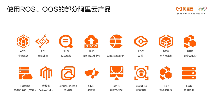 下图中列出了支持 ROS、OOS 的常见阿里云产品,包括 ACS 容器服务、FC 函数计算、SLS 日志服务、SMC 服务迁移中心等等,这与产品本身的部署场景契合。