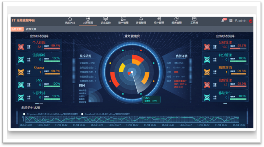 PIGOSS BSM的业务大屏对各类业务系统,从基础网络、系统服务、中间件、数据库和存储设备多个层级进行全方位监控,为运维管理人员提供全局的业务健康度一览。业务雷达图及状态矩阵实时扫描各业务系统的最新告警及业务健康度,产出故障可直接追溯到最底层的告警源设备,便于运维工程师快速找到故障点。