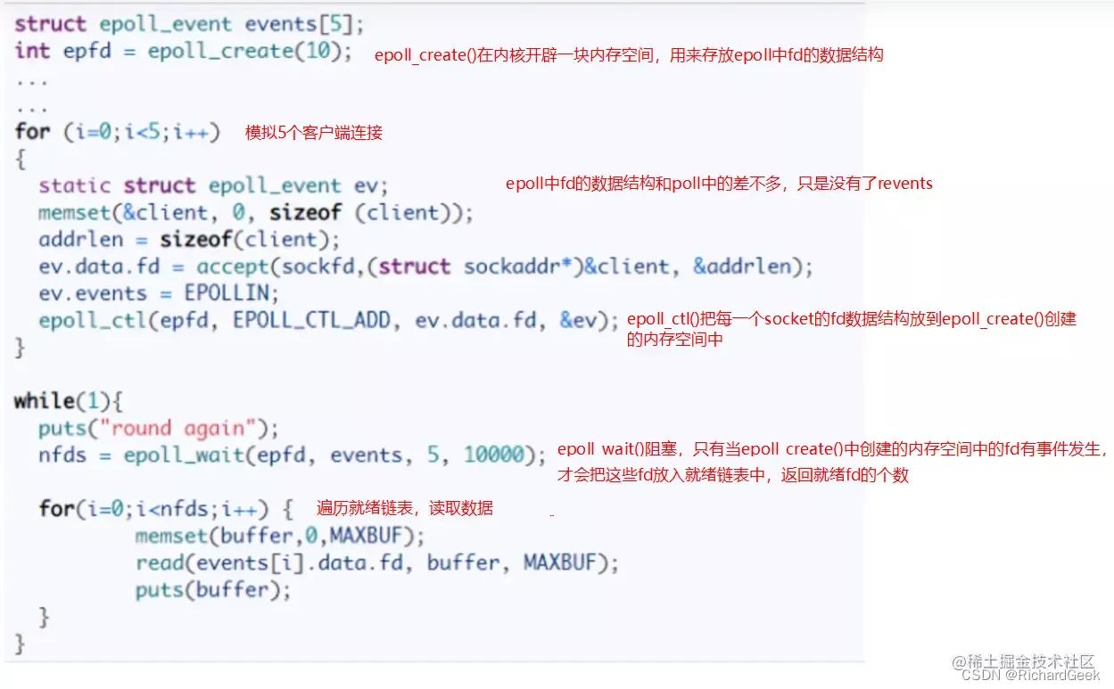 对于第一个缺点,epoll的解决方案在epoll_ctl函数中。每次注册新的事件到epoll句柄中时(在epoll_ctl中指定EPOLL_CTL_ADD),会把所有的fd拷贝进内核,而不是在epoll_wait的时候重复拷贝。epoll保证了每个fd在整个过程中只会拷贝一次。