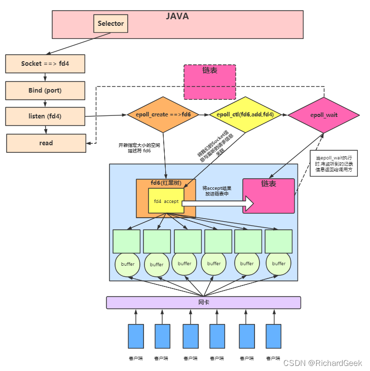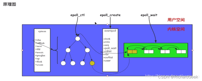 1.通过调用epoll_create,在epoll文件系统建立了个file节点,并开辟epoll自己的内核高速cache区,建立红黑树,分配好想要的size的内存对象,建立一个list链表,用于存储准备就绪的事件。即首先epoll_create创建epoll实例,它会创建所需要的红黑树,以及就绪链表,以及代表epoll实例的文件句柄。其实就是在内核开辟一块内存空间,所有与服务器连接的socket都会放到这块空间中,这些socket以红黑树的形式存在,同时还会有一块空间存放就绪链表;红黑树存储所监控的文件描述符的节点数据,就绪链表存储就绪的文件描述符的节点数据;