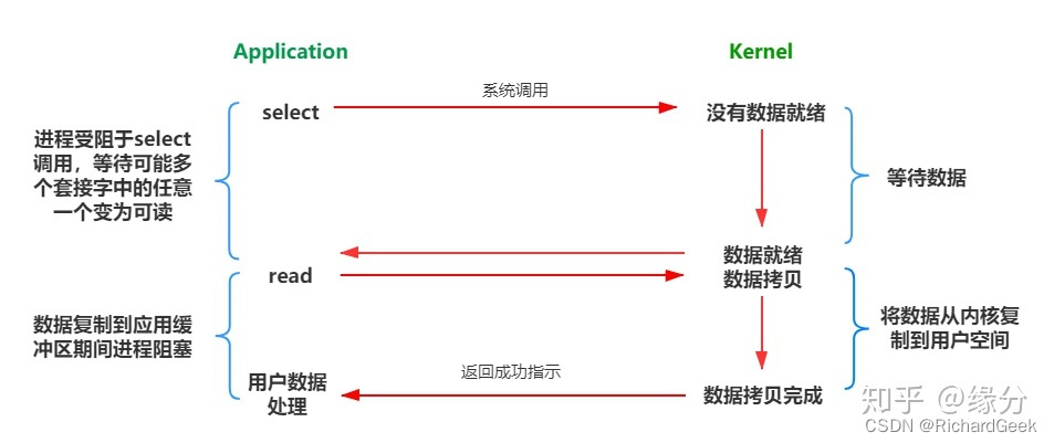 当用户进程调用select,那么整个进程会被阻塞,同时,内核会监视所有select负责的socket,当任何一个socket中的数据准备好了,select就会返回,这个时候用户进程再调用read操作,将数据从内核拷贝到用户进程。