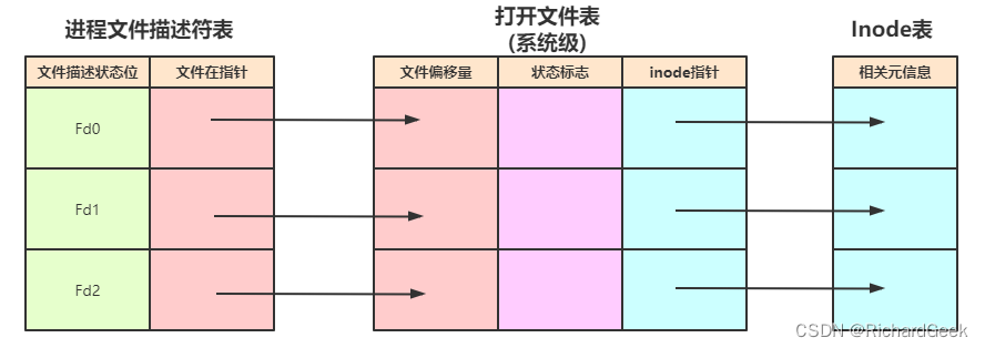 每一个文件描述符会与一个打开文件相对应,同时不同的文件描述符也会指向同一个文件。相同的文件可以被不同的进程打开,也可以在同一个进程中被多次打开。系统为每一个进程维护了一个文件描述符表,该表的值都是从0开始的,所以在不同的进程中你会看到相同的文件描述符。这种情况下相同文件描述符有可能指向同一个文件,也有可能指向不同的文件。具体情况要具体分析,要理解具体其概况如何,需要查看由内核维护的3个数据结构。
