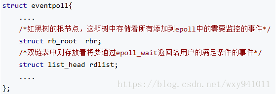 当某一进程调用epoll_create方法时,Linux内核会创建一个eventpoll结构体,这个结构体中有两个成员与epoll的使用方式密切相关。eventpoll结构体如下所示: