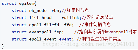 在epoll中,对于每一个事件,都会建立一个epitem结构体,如下所示: