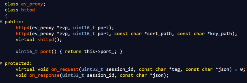 两个构造函数,第一个是搭建http服务器,第二个需要证书和私钥用于搭建https服务器;参数需要给ev_proxy的对象指针还有port,port是网络端口。收到数据后会回调on_request给上层应用,上层应用处理完需要调用on_response进行响应。