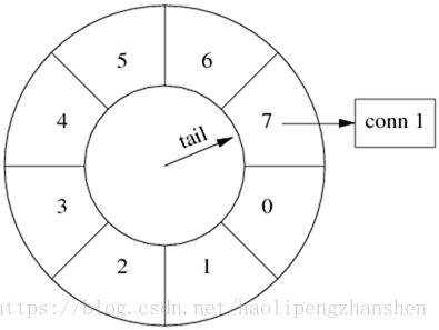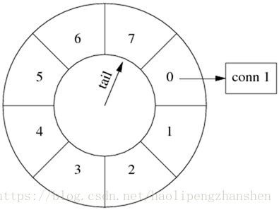 又过了几秒钟,tail 指向 conn 1 之前的那个格子,conn 1 即将被断开。