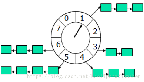 定时轮的工作原理可以类比于始终,如上图箭头(指针)按某一个方向按固定频率轮动,每一次跳动称为一个 tick。
