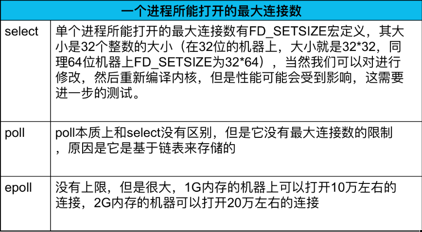 epoll没有这个限制,它所支持的最大 fd 上限远远大于1024,在1GB内存的机器上是10万左右(具体数目可以cat/proc/sys/fs/file-max查看)