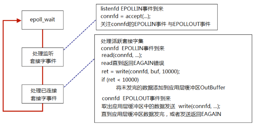 epfd = epoll_create1(EPOLL_CLOEXEC); event.events = EPOLLET | EPOLLIN; event.data.fd = serverfd; epoll_ctl(epfd, EPOLL_CTL_ADD, serverfd, &event); // 主循环 while(true) { // 这里的timeout很重要,实际使用中灵活调整 count = epoll_wait(epfd, &events, MAXEVENTS, timeout); for(i = 0; i < count; ++i) { if(events[i].events & EPOLLERR || events[i].events & EPOLLHUP) // 处理错误 if(events[i].data.fd == serverfd) // 为接入的连接注册事件 else if(events[i].events & EPOLLIN) // 处理可读的缓冲区 read(events[i].data.fd, buf, len); event.events = EPOLLET | EPOLLOUT; event.data.fd = events[i].data.fd; epoll_ctl(epfd, EPOLL_CTL_MOD, events[i].data.fd, &event); else // 处理可写的缓冲区 write(events[i].data.fd, buf, len); // 后续可以关闭fd或者MOD至EPOLLOUT } }