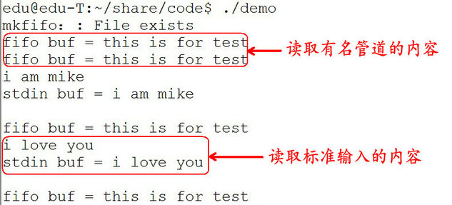 我们写这么一个例子,同时循环读取标准输入的内容,读取有名管道的内容,默认的情况下,标准输入没有内容,read()时会阻塞,同样的,有名管道如果没有内容,read()也会阻塞,我们如何实现循环读取这两者的内容呢?最简单的方法是,开两个线程,一个线程循环读标准输入的内容,一个线程循环读有名管道的内容。而在这里,我们通过 select() 函数实现这个功能:
