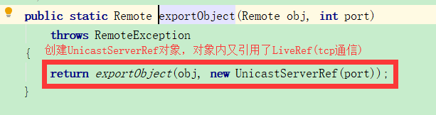 setup方法将指向正在初始化的RegistryImpl对象的远程引用ref(RemoteRef)赋值为传入的UnicastServerRef对象,这里涉及到向上转型,然后继续执行UnicastServerRef的exportObject方法