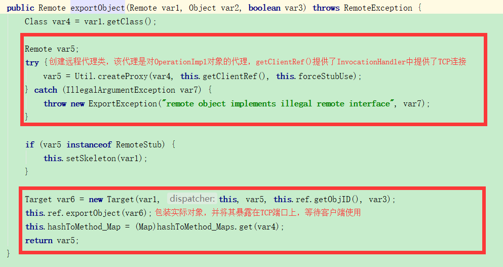 进入UnicastServerRef的exportObject()方法。可以看到,这里首先为传入的RegistryImpl创建一个代理,这个代理我们可以推断出就是后面服务于客户端的RegistryImpl的Stub(RegistryImpl_Stub)对象。然后将UnicastServerRef的skel(skeleton)对象设置为当前RegistryImpl对象。最后用skeleton、stub、UnicastServerRef对象、id和一个boolean值构造了一个Target对象,也就是这个Target对象基本上包含了全部的信息,等待TCP调用。调用UnicastServerRef的ref(LiveRef)变量的exportObject()方法。