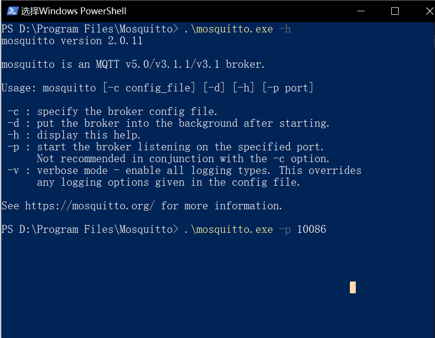 ./mosquitto.exe -p 10086,就开启了MQTT服务,监听的地址是127.0.0.1,端口是10086;