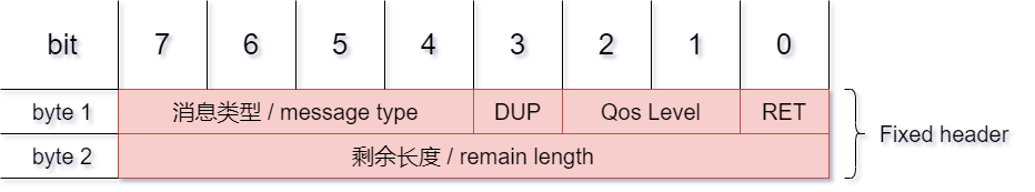 固定头(Fixed header),存在于所有MQTT数据包中,表示数据包类型及数据包的分组类标识; -