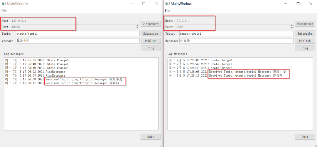 然后订阅主题,就可以互相发送数据了,具体如下图所示;