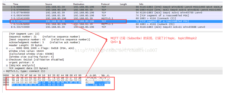 从上图的抓包程序得到的数据可知,负载部分实际捕获的数据为:00 06 74 6f 70 69 63 31 01 00 06 74 6f 70 69 63 32 01 因为总共有两个主题:topic1 和topic2,所以我们拿第一个主题(topic1)来分析就行了,后面的Topic类似.