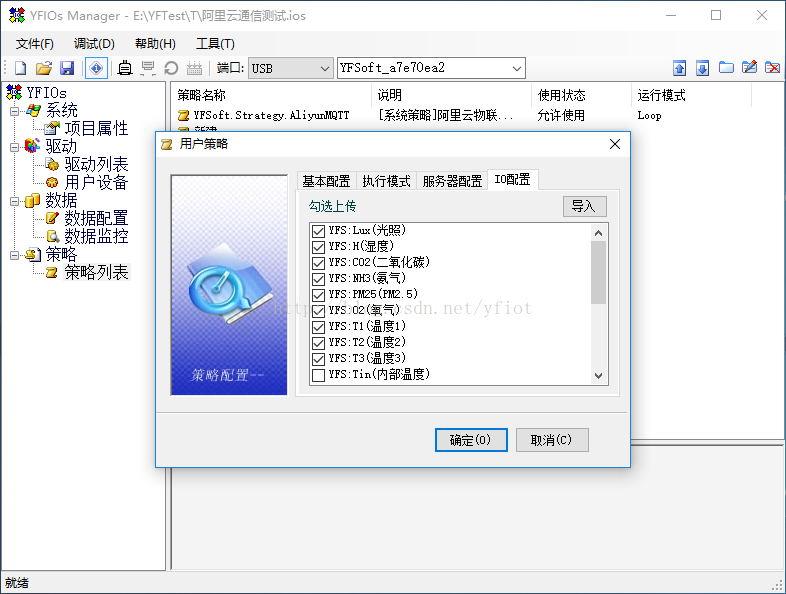 除了自行编写代码外,为了便于各种传感器和智能模块的接入,我们还采用了YFIOs组态的方式去连接阿里云物联网套件,这样无需编程,就可以快速和云端进行双向通信了。