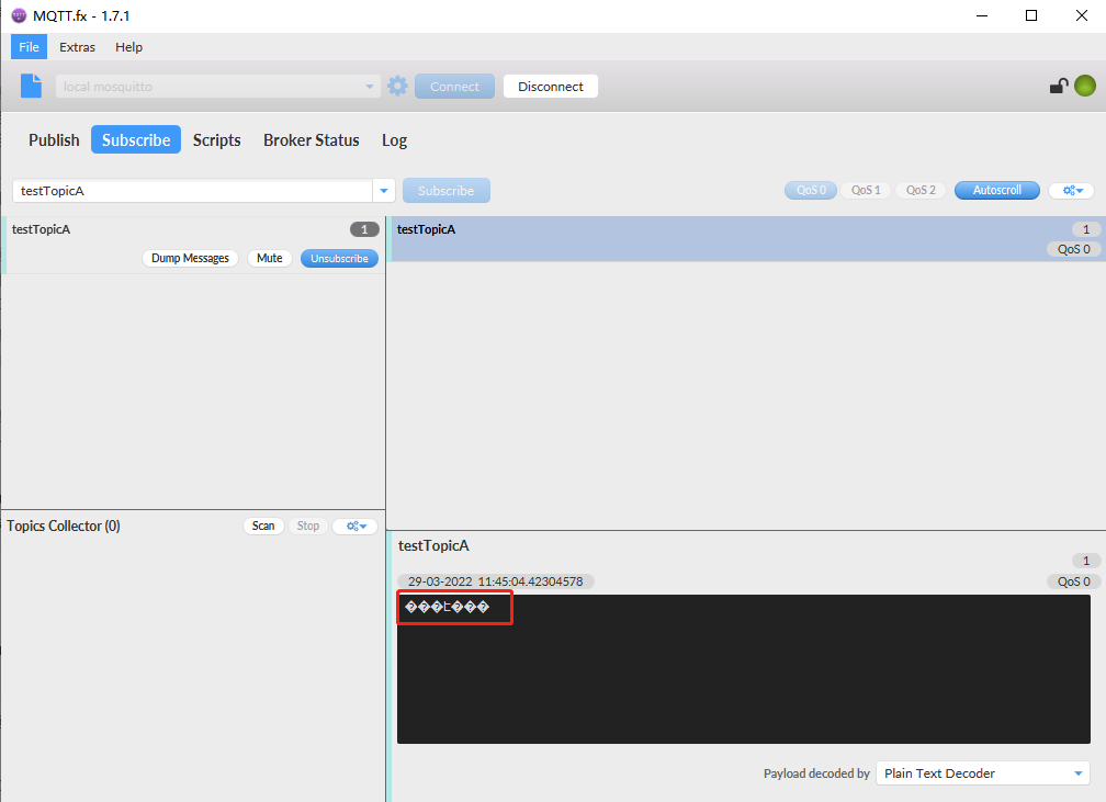 然后切到订阅模块,输入【testTopicA】主题进行订阅: