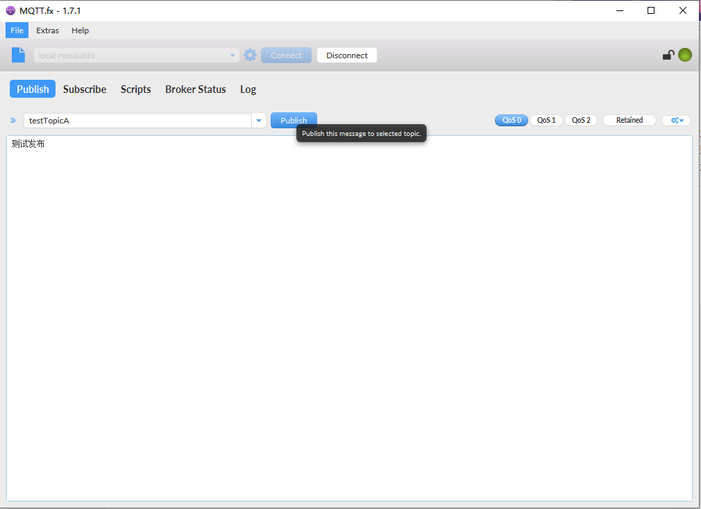 首先发布一个主题名为【testTopicA】的主题,输入内容后点击发布,如下图所示: