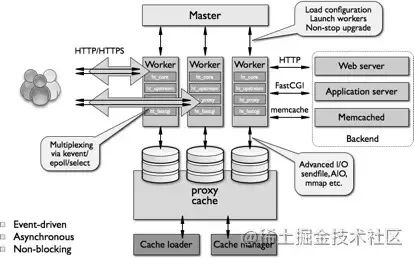 worker进程则是处理基本的网络事件。多个worker进程之间是对等的,他们同等竞争来自客户端的请求,各进程互相之间是独立的。一个请求,只可能在一个worker进程中处理,一个worker进程,不可能处理其它进程的请求。