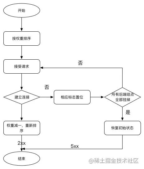图中有两点需要注意,第一,如果可以把加权轮询算法分为先深搜索和先广搜索,那么nginx采用的是先深搜索算法,即将首先将请求都分给高权重的机器,直到该机器的权值降到了比其他机器低,才开始将请求分给下一个高权重的机器;第二,当所有后端机器都down掉时,nginx会立即将所有机器的标志位清成初始状态,以避免造成所有的机器都处在timeout的状态,从而导致整个前端被夯住。