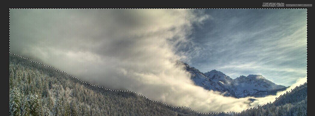 在Photoshop中用暗灰色的背景中建立一个新画布,文件大小1280px * 800px。 打开“山1”图像,选择图像的天空和山脉的一部分: