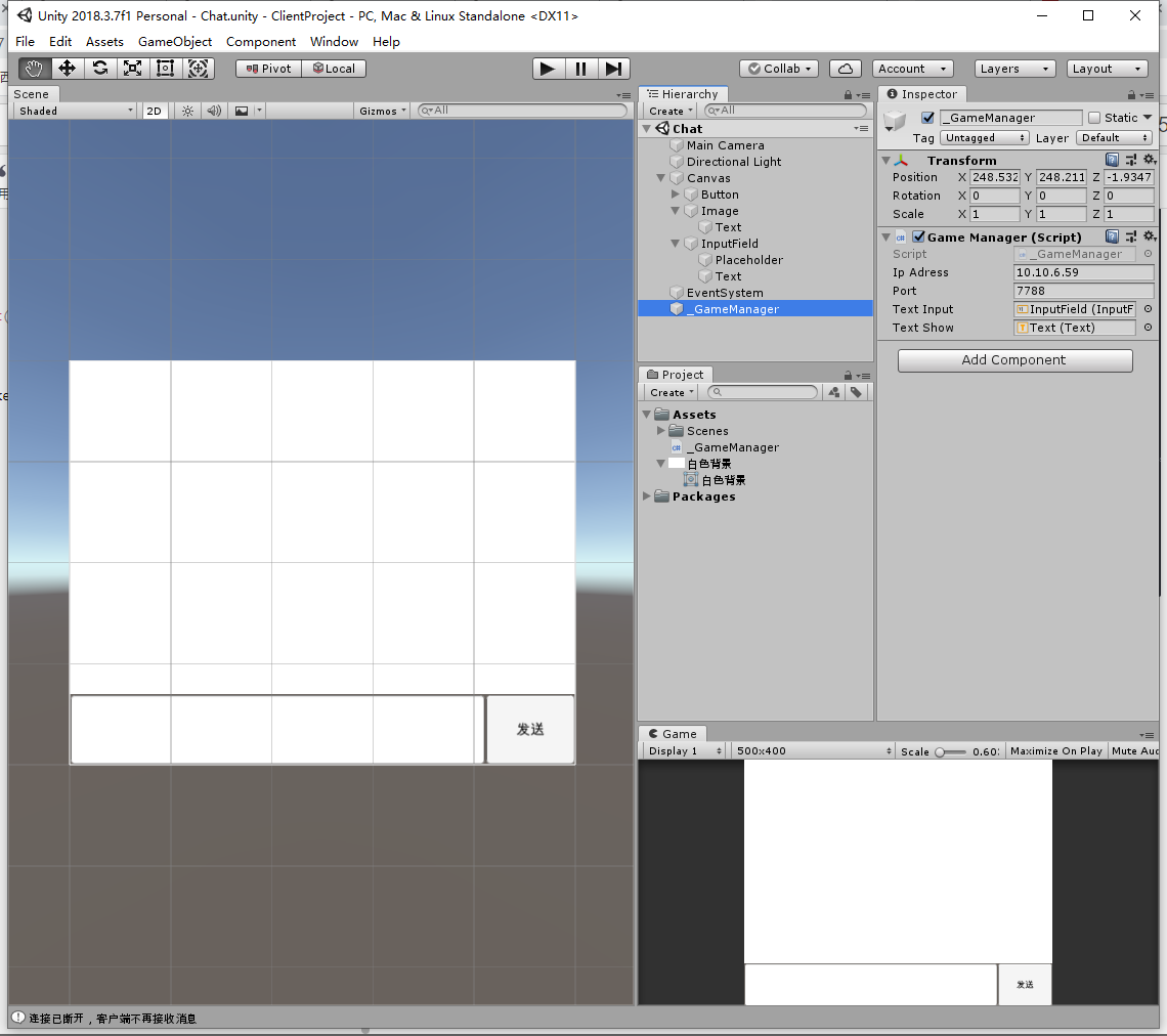 添加一个空物体命名为_GameManager,挂载客户端脚本。