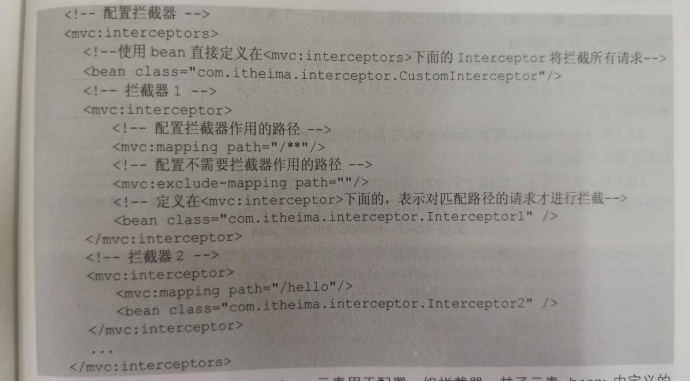 需要注意的是,<mvc:interceptor> 中的子元素必须按照上述代码的配置顺序进行编写,即<mvc:mapping .../> -> <mvc:exclude-mapping .../> -> <bean .../>的顺序,否则文件会报错。