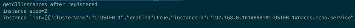注册完成后,通过调用 getAllInstances 方法,立即获取所有可用的实例,然后让主线程等待,打印如下: