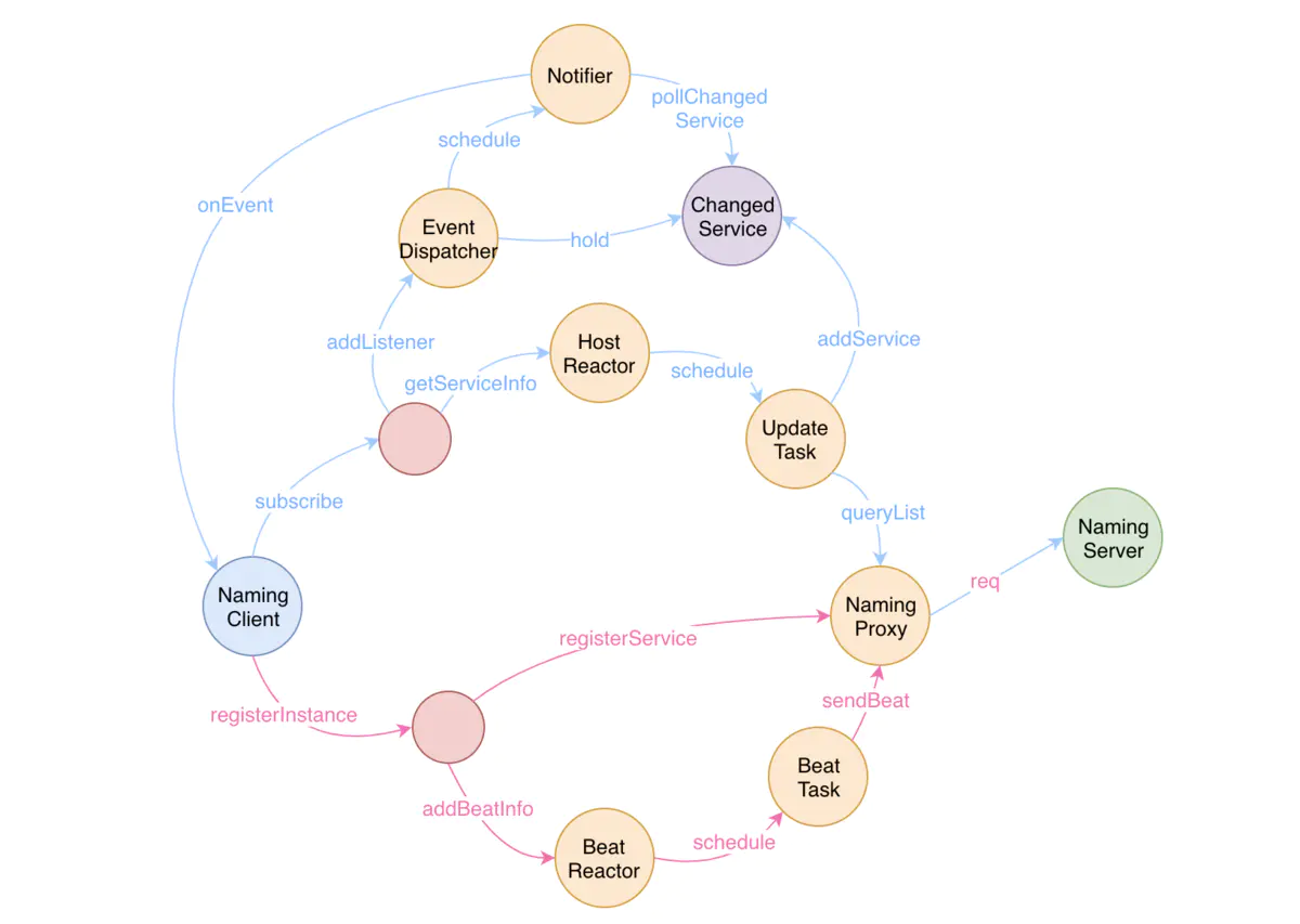 Nacos 客户端进行服务订阅时也有两部分组成,一个是不断从服务端查询可用服务实例的定时任务,另一个是不断从已变服务队列中取出服务并通知 EventListener 持有者的定时任务。