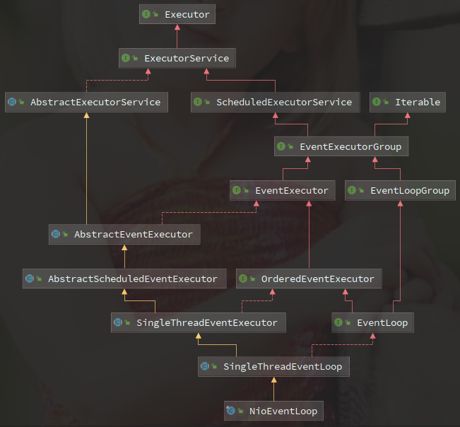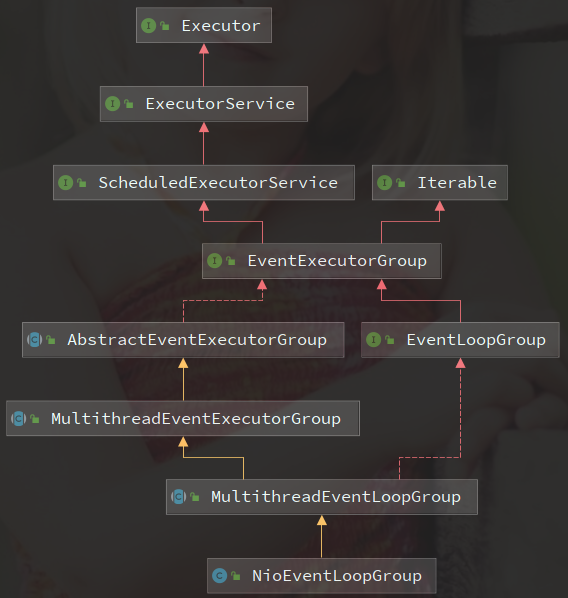 EventLoopGroup和EventLoop其实就相当于线程池(或者说线程组)和线程,下面是NioEventLoopGroup和NioEventLoop的继承类图