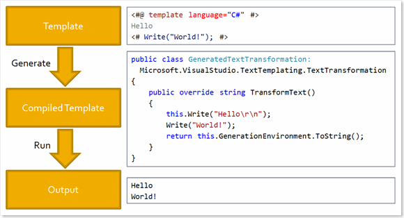 在实现模型驱动开发中,我们可以解释模型直接运行在领域框架之上,也可以把模型通过代码生成技术转换成代码之后编译运行在框架之上。这两种方式都有利弊,可以搭配使用,在OpenExpessApp中将采用这两种方法,类库通过代码生成,UI等元模型通过框架解释执行。由于代码生成是MDD中很重要的一项技术,所以本篇我将介绍一下代码生成相关的知识。