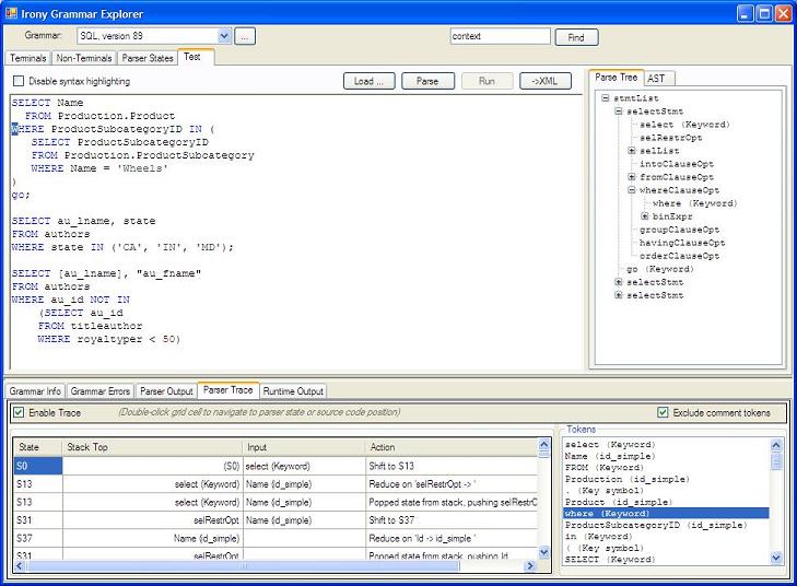 Irony is a development kit for implementing languages on .NET platform. It uses the flexibility and power of c# language and .NET Framework 3.5 to implement a completely new and streamlined technology of compiler construction. Unlike most existing yacc/lex-style solutions Irony does not employ any scanner or parser code generation from grammar specifications written in a specialized meta-language. In Irony the target language grammar is coded directly in c# using operator overloading to express grammar constructs. Irony's scanner and parser modules use the grammar encoded as c# class to control the parsing process. See the expression grammar sample for an example of grammar definition in c# class, and using it in a working parser.