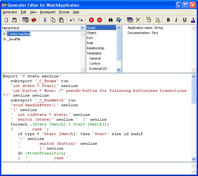 MetaEdit+提供代码生成编辑器,还支持生成的调试。OpenExpressApp采用类似MetaEdit+的元元模型来编写语言,所以将来的代码生成可能也会主要参考它来做。具体可参考安装程序目录中的User's Guides 的 MetaEdit+ Workbench 代码生成章节内容。