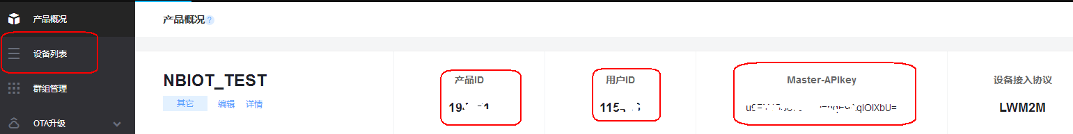 3.2、看到有产品ID和APIKey等信息,然后我们点击设备列表: