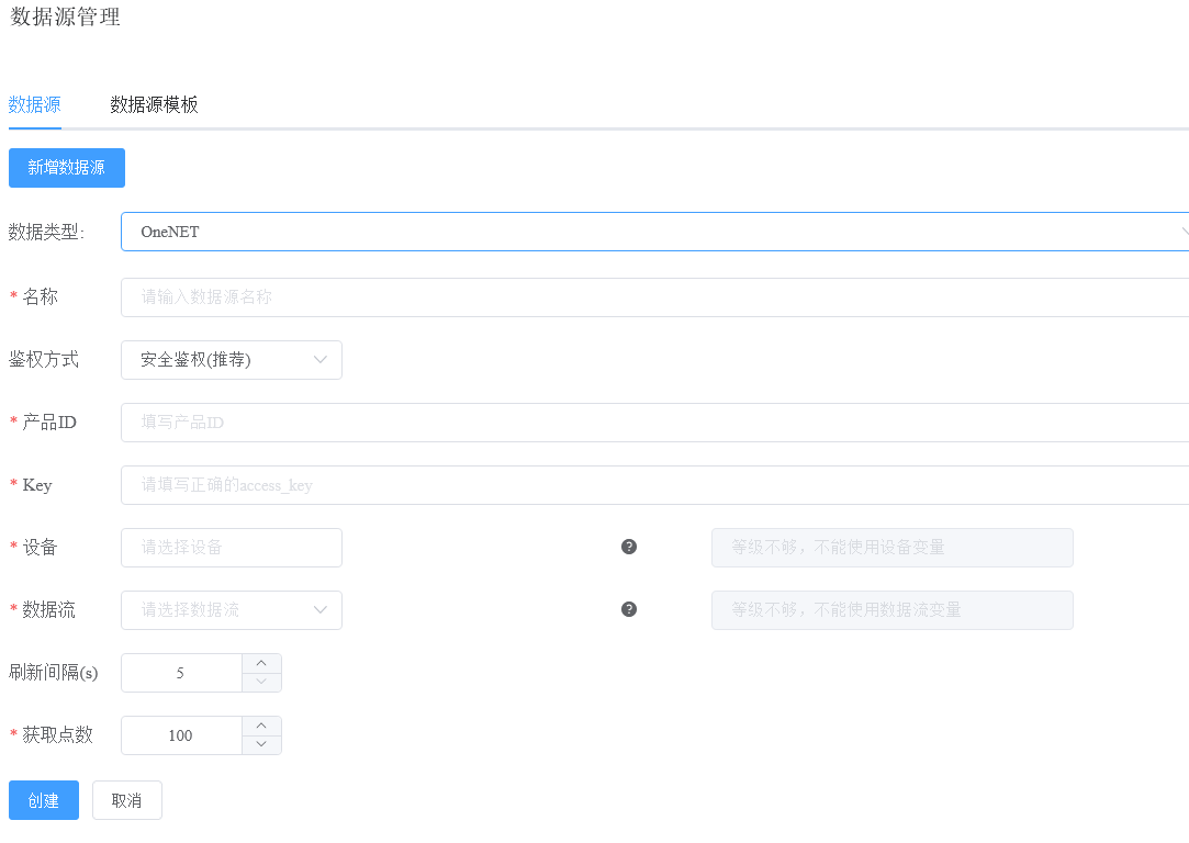 数据类型选择onenet,后面就是填写你创建的设备的信息:
