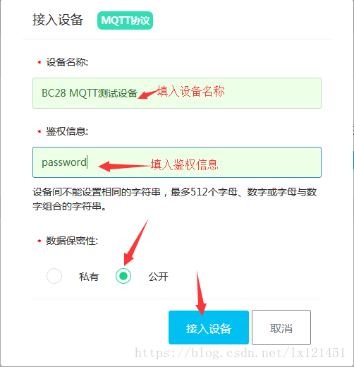 在设备添加对话框中输入和勾选相应的信息,如下图,点击接入设备,完成设备添加。此处的鉴权信息需要牢记,接入的时候会用到