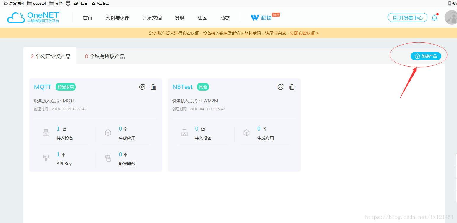 点击开发者中心,进入开发者中心,点击右上角的创建产品,开始创建产品。