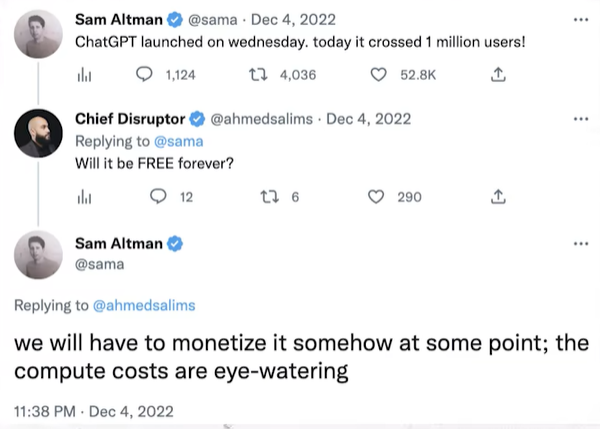 OpenAI公司也明确表示以后会通过某种方式去向用户收费,有可能是给用户一个subscription或者是把广告放到ChatGPT里面,总之盈利的这些工作就是由OpenAI LP来负责,现在我们可以把OpenAI理解成,介于研究型机构和商业公司之间的一个定位。只不过他是在慢慢的向商业公司靠拢,OpenAI的这个转变主要是人力和算力都是很烧钱的,特别是这个算力。
