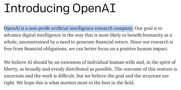 - OpenAI NonProfit(OpenAI Inc.),日常工作没有变化,依然是通过开发新的AI技术,而非商业产品来创造最大的价值,