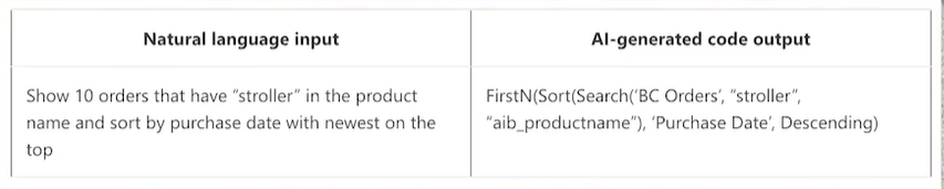 用户想要显示“10个产品名称中包含自行车的订单”,并按照购买日期排序,最新的排在前面,右边的这个程序显示了GPT返回的结果。让power这种低代码工具(low-code tool)真正的成为一个无代码的工具(no-code tool),它的受众会变得更加的广泛,