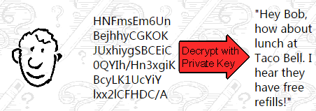1.4、鲍勃收信后,用私钥解密,就看到了信件内容。这里要强调的是,只要鲍勃的私钥不泄露,这封信就是安全的,即使落在别人手里,也无法解密。